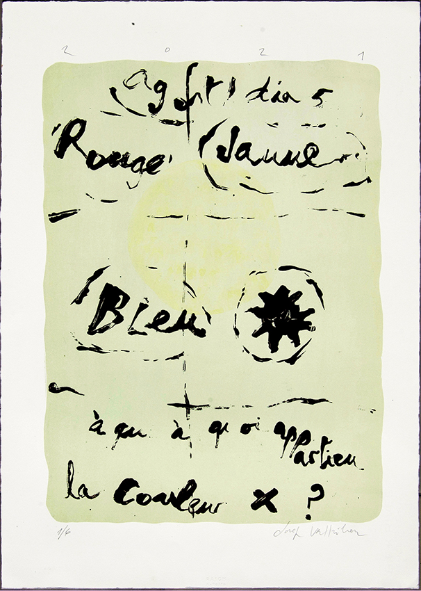 Ereignisse und kultiviertere Bilder III / 2021 Steinlithographie "Rouge-Jaune-Bleu (rot-gelb-blau)" von Josep Vallribera lithographiert in 2 Farben und zusätzlich von Hand coloriert der Druck ist 40 x 30 cm, das Papier 56 x 45,5 cm Auflage: 1/6 -6/6 nummeriert und signiert gedruckt von Kurt Raich, Telfs, Österreich |